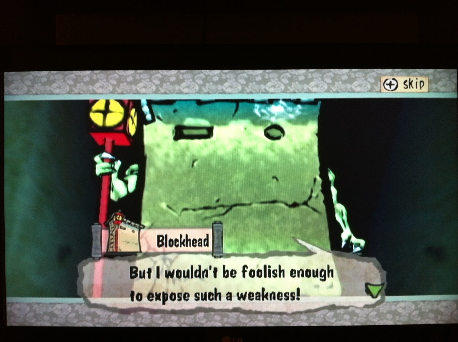 Somehow, his tiny sneeze was enough to crack the ramp into a million pieces, which threatened to fall out from under me if I didn't move across them fast enough. I feel like I've experienced something like this in a Zelda game before...ah, well. We made it to the top of the ramp, where we found a door with THIS on it...